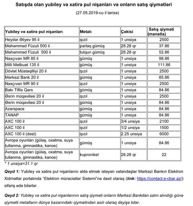 Mərkəzi Bankı bildirir ki, Bankın rəsmi internet səhifəsinin "Milli pul nişanları" bölməsində satışda olan yubiley və xatirə pul nişanları, o cümlədən onların satış qiymətləri barədə məlumatlar gündəlik olaraq yerləşdirilməsinə başlanılıb (link: https://www.cbar.az/moneymarks/coins?category=2).