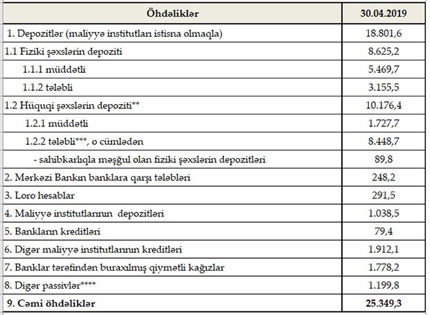 30 aprel 2019-cu il tarixinə Azərbaycanda fəaliyyət göstərən bankların cəmi aktivləri 29 milyard 769.1 milyon manat, cəmi öhdəlikləri isə 25 milyard 349.3 milyon manat təşkil edib. Sektorun balans kapitalı 4 milyard 419.8 milyon manat olub.