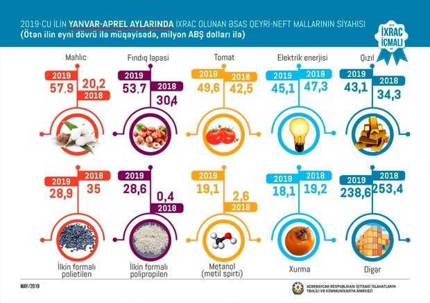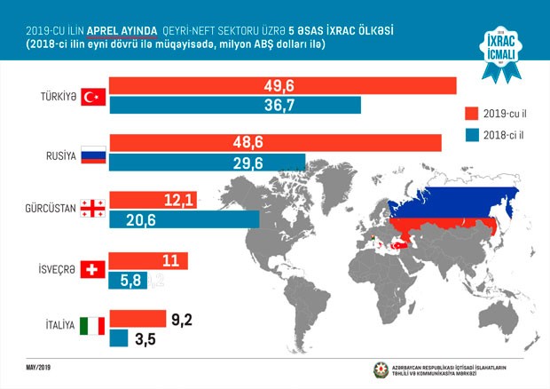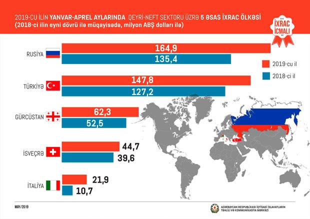 2018-ci ilin müvafiq dövrü ilə müqayisədə 2019-cu ilin ilk dörd ayında Rusiyaya qeyri-neft ixracı 22 faiz, Türkiyəyə 16 faiz, Gürcüstana 19 faiz, İsveçrəyə 13 faiz, İtaliyaya 2 dəfə artıb.