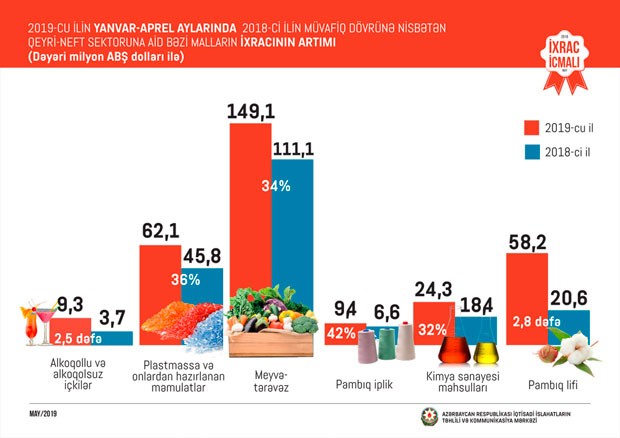 2018-ci ilin müvafiq dövrü ilə müqayisədə cari ilin yanvar-aprel aylarında alkoqollu və alkoqolsuz içkilərin ixracı 2,5 dəfə, pambıq lifinin ixracı 2,8 dəfə, pambıq ipliyinin ixracı 42 faiz, plastmassa və onlardan hazırlanan məmulatların ixracı 36 faiz, meyvə-tərəvəzin ixracı 34 faiz, kimya sənayesi məhsullarının ixracı 32 faiz artıb.