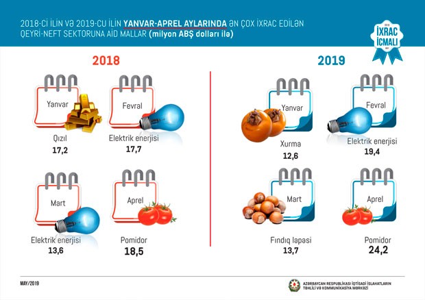 2019-cu ilin aprel ayında isə qeyri-neft sektoru üzrə ixrac 167 milyon ABŞ dolları təşkil edib. 2018-ci ilin aprel ayı ilə müqayisədə bu ilin aprel ayında qeyri-neft sektoru üzrə ixrac 38 milyon ABŞ dolları və ya 29 faiz artıb. Cari ilin aprel ayında qeyri-neft sektoruna aid ən çox mal Rusiyaya (49,6 milyon ABŞ dolları), Türkiyəyə (48,6 milyon ABŞ dolları) və Gürcüstana (12 milyon ABŞ dolları) ixrac edilib.