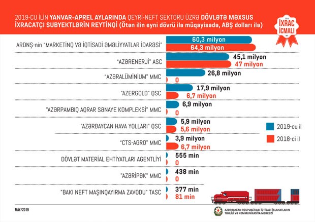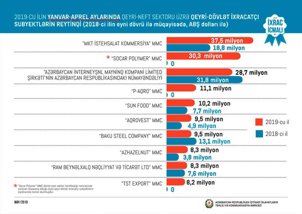 Bu ilin yanvar-aprel ayları üzrə hazırlanan qeyri-dövlət ixracatçı subyektlərin reytinqində ilk onluqda aşağıdakı şirkətlər təmsil olunurlar: "MKT İstehsalat Kommersiya" MMC, “Socar Polymer” MMC, "Azərbaycan İnterneyşnl Mayninq Kompani Limited Şirkəti"nin Azərbaycan Respublikasındakı nümayəndəliyi, "P-Aqro" MMC, “Sun Food" MMC, "Aqrovest" MMC, "Baku Steel Company" MMC, “Azhazelnut” MMC, "Ram Beynəlxalq Nəqliyyat və Ticarət LTD" MMC, "TST Export" MMC