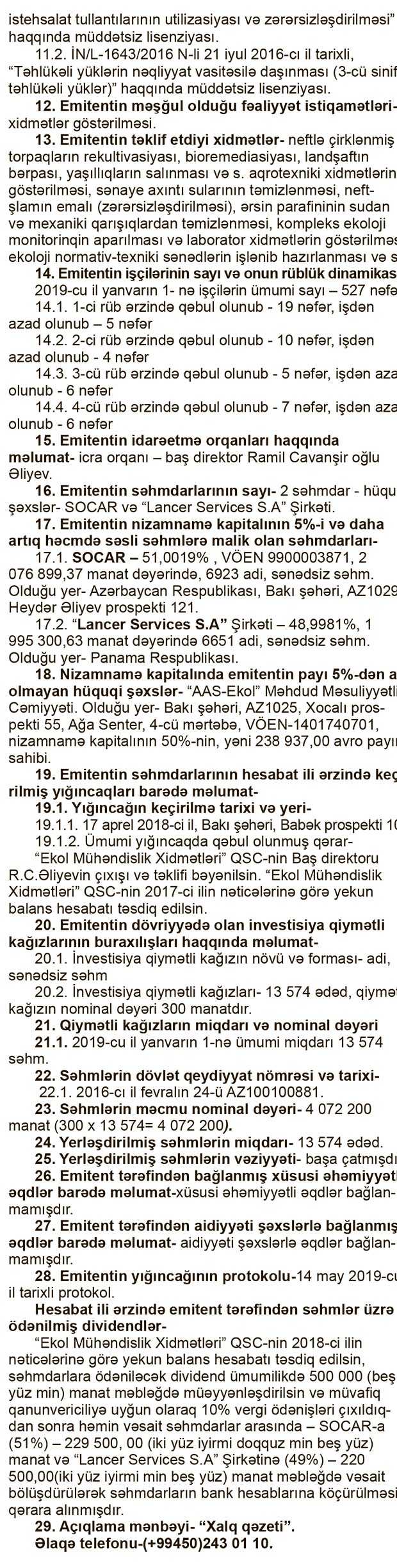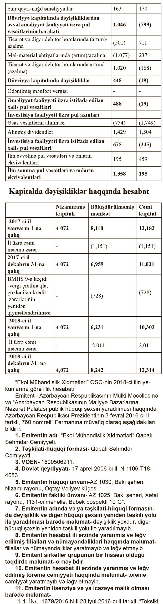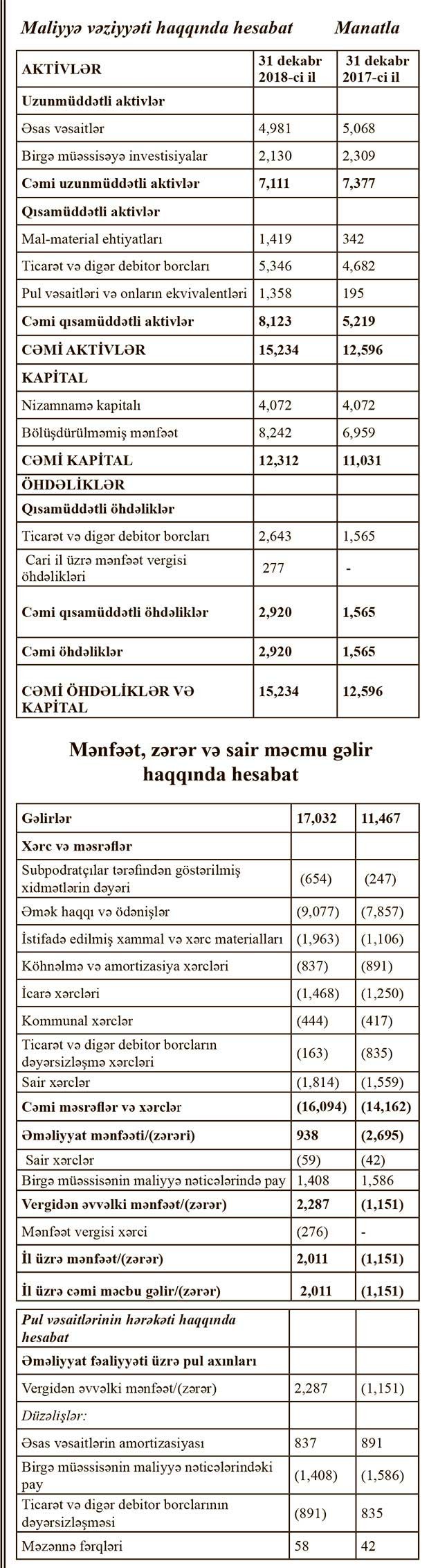 “EKOL MÜHƏNDİSLİK XİDMƏTLƏRİ” QSC-nin 2018-ci il dekabrın 31-nə maliyyə hesabatı