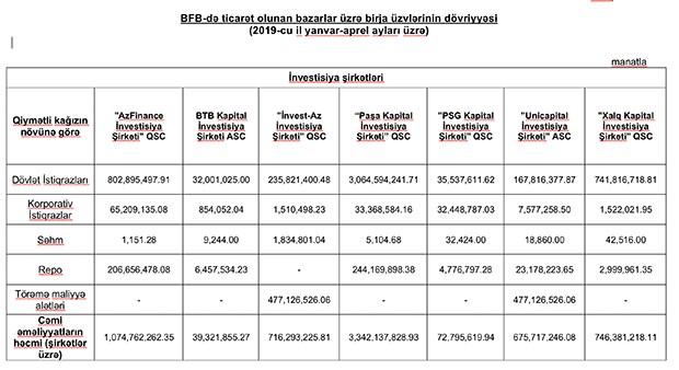 Birjadan "Marja"ya daxil olmuş məlumata görə, "PSG Kapital İnvestisiya Şirkəti" QSC 3 milyard 342 milyon manat dövriyyə ilə 1-ci, "AzFinance İnvestisiya Şirkəti" QSC 1 milyard 74 milyon manat dövriyyə ilə 2-ci, "Xalq Kapital İnvestisiya Şirkəti" QSC 746 milyon 381 min manat dövriyyə ilə 3-cü, "İnvest-Az İnvestisiya Şirkəti" QSC 716 milyon 293 min manat dövriyyə ilə 4-cü yeri tutub.