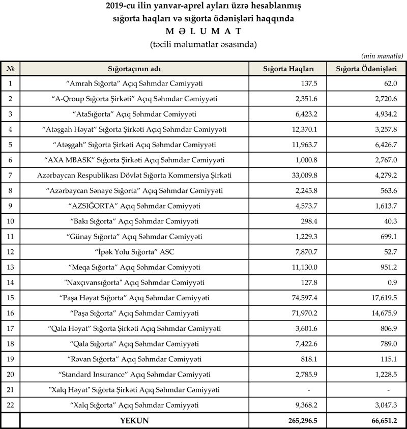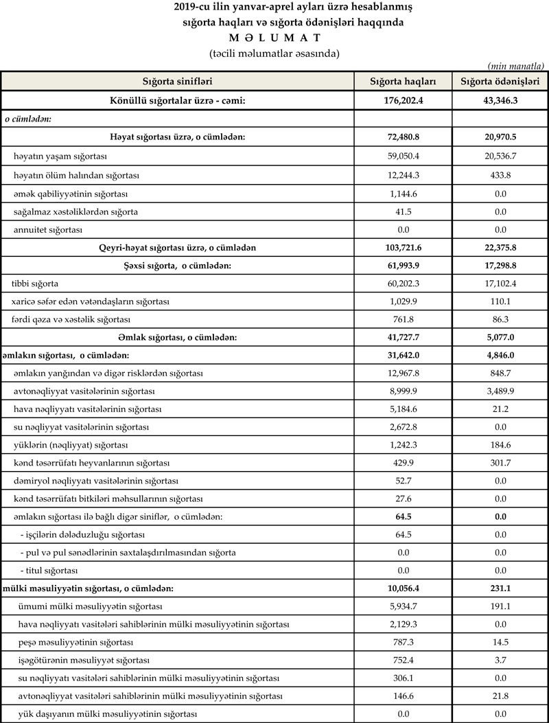2019-cu ilin yanvar-aprel aylarında ölkədə fəaliyyət göstərən sığorta şirkətləri tərəfindən 265.3 mln. manat məbləğində sığorta haqları toplanıb, 66.7 mln. manat məbləğində sığorta ödənişləri həyata keçirilib.