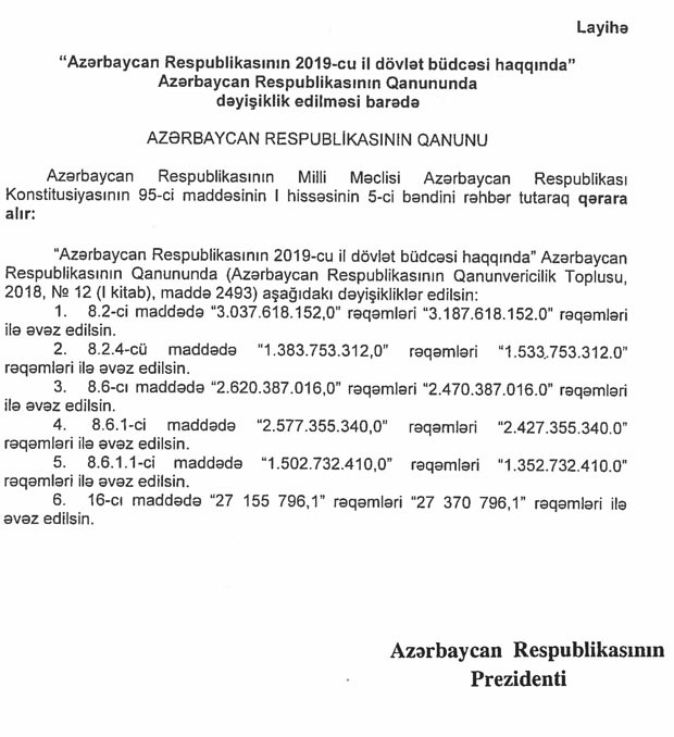Azərbaycan Prezidenti İlham Əliyev tərəfindən “Azərbaycan Respublikasının 2019-cu il dövlət büdcəsi haqqında” Azərbaycan Respublikasının Qanununda dəyişikliklər edilməsi barədə” qanun layihəsi Milli Məclisə təqdim olunub.