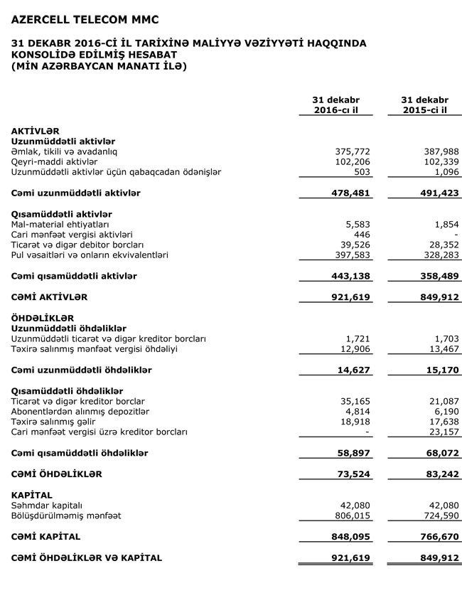 31 Dekabr 2016-cı il tarixinə Azercell-in cəmi aktivləri 921 milyon 619 min manat (2015-də 724 milyon 590 min manat idi), öhdəlikləri 73 milyon 524 min manat (2015-də 83 milyon 242 min manat idi), cəmi kapitalı isə 848 milyon 95 min manat təşkil edib. Cəmi kapitalın 806 milyon 15 min manatını bölüşdürülməmiş mənfəət təşkil edib.