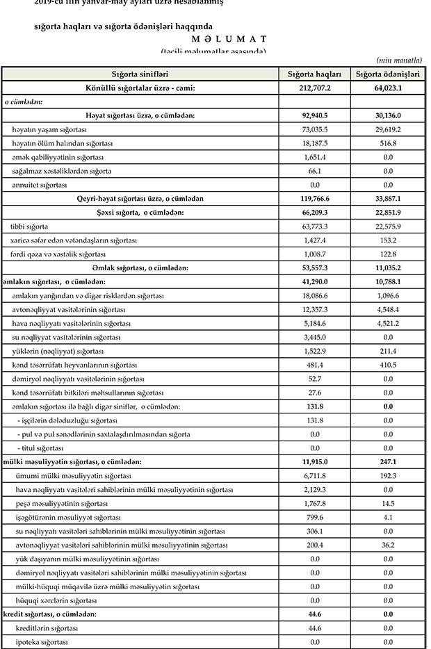 2019-cu ilin yanvar-may aylarında ölkədə fəaliyyət göstərən sığorta şirkətləri tərəfindən 319.3 milyon manat məbləğində sığorta haqları toplanıb, 93.8 milyon manat məbləğində sığorta ödənişləri həyata keçirilib.