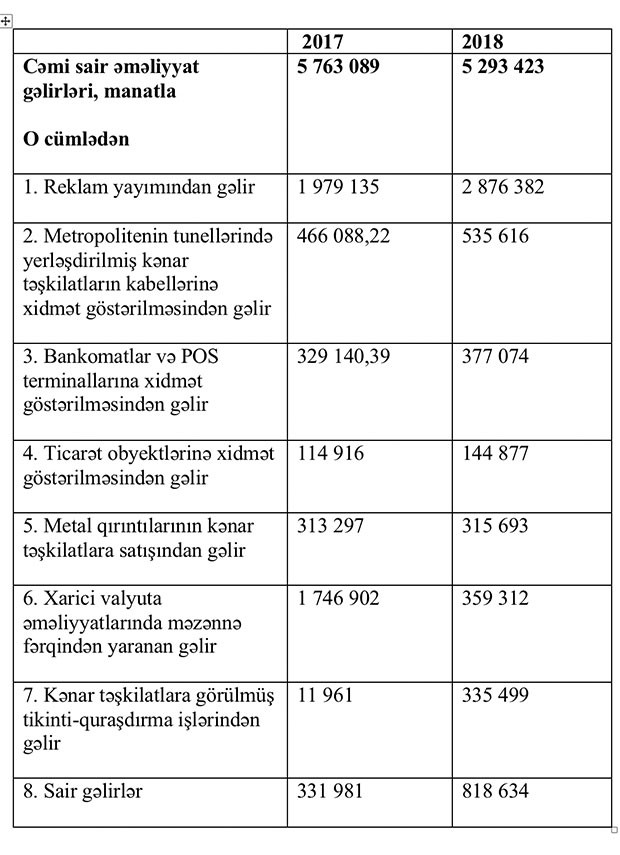 “Bakı Metropoliteni”nin "sair gəlirlər"inin tərkibi ilə aşağıdakı cədvəldən tanış ola bilərsiniz.