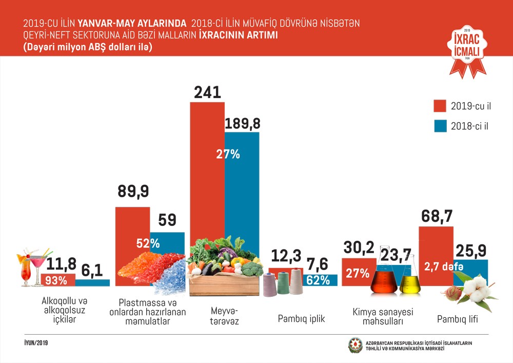 2018-ci ilin müvafiq dövrü ilə müqayisədə bu ilin yanvar-may aylarında pambıq lifinin ixracı 2,7 dəfə, alkoqollu və alkoqolsuz içkilərin ixracı 93 faiz, pambıq ipliyinin ixracı 62 faiz, plastmassa və onlardan hazırlanan məmulatların ixracı 52 faiz, meyvə-tərəvəzin ixracı 27 faiz, kimya sənayesi məhsullarının ixracı 27 faiz artıb.