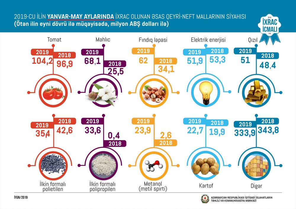 2019-cu ilin may ayında qeyri-neft sektoru üzrə ixracda pomidor (54,6 milyon ABŞ dolları) birinci, kartof (20,2 milyon ABŞ dolları) ikinci, polimerləşmə nəticəsində əmələ gələn ilkin formalı digər maddələr (12,9 milyon ABŞ dolları) üçüncü olub.