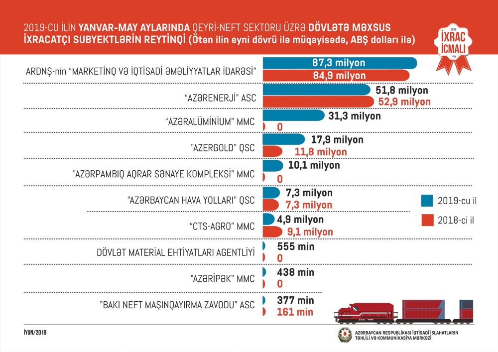 Qeyri-neft sektoru üzrə ixrac əməliyyatlarında iştirak edən dövlətə məxsus şirkətlərin siyahısına isə ARDNŞ-nin “Marketinq və İqtisadi Əməliyyatlar İdarəsi” başçılıq edir. Daha sonra bu siyahıda aşağıdakı şirkətlər təmsil olunurlar: "Azərenerji" ATSC, "Azəralüminium" MMC, "Azergold" QSC, "Azərpambıq Aqrar Sənaye Kompleksi" MMC, "Azərbaycan Hava Yolları" QSC, “CTS-Agro” MMC, Dövlət Material Ehtiyatlari Agentliyi, "Azəripək" MMC, "Bakı Neft Maşınqayırma Zavodu" TASC.