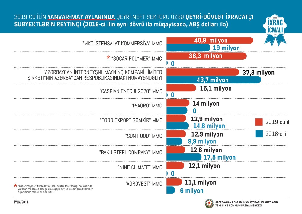 “Marja” xəbər verir ki, “İxrac İcmalı”nın iyun sayında qeyri-neft sektoru üzrə əsas ixracatçı şirkətlərin reytinqi verilib. Bu ilin yanvar-may ayları üzrə hazırlanan qeyri-dövlət ixracatçı subyektlərin reytinqində ilk onluqda aşağıdakı şirkətlər təmsil olunurlar: