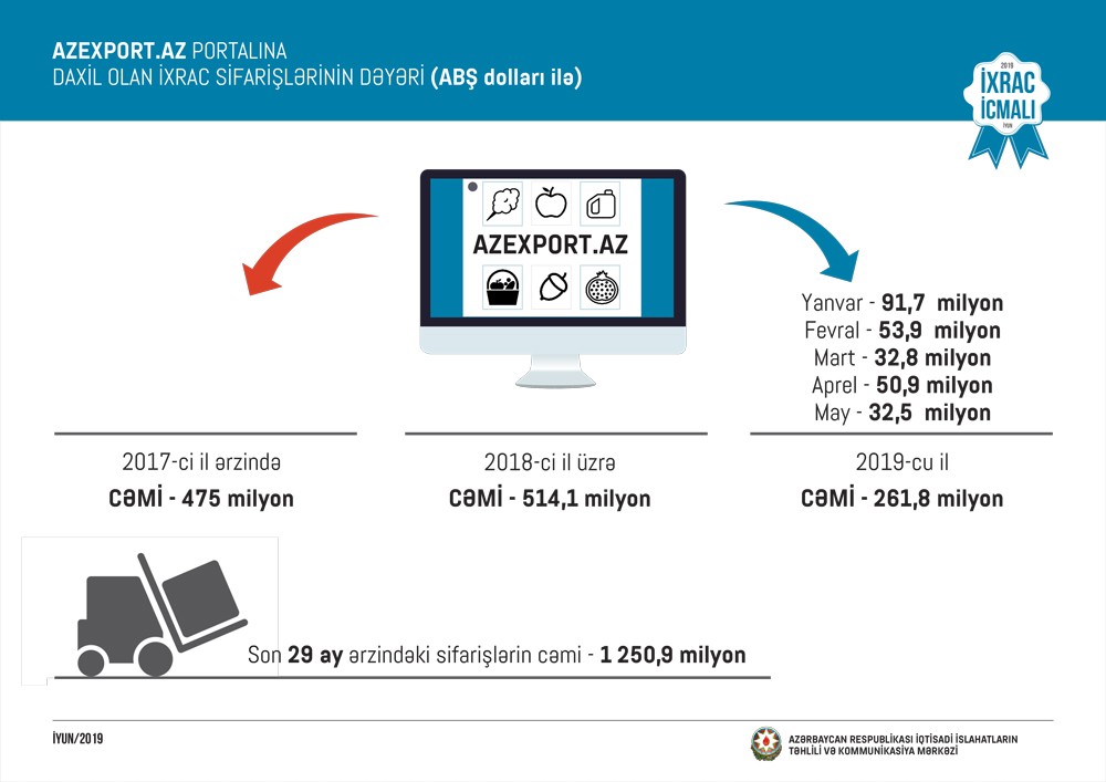 Məlumat üçün qeyd edək ki, 2017-ci ilin yanvar ayından 2019-cu ilin 31 may tarixinə kimi (29 ay ərzində) Azexport.az portalına dünyanın 130 ölkəsindən daxil olan ixrac sifarişlərinin dəyəri 1 milyard 250,9 milyon ABŞ dolları təşkil edib.