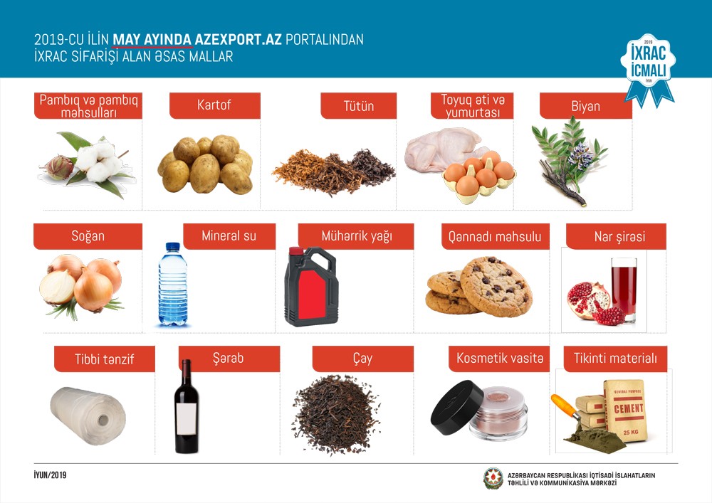 Bu ilin may ayında ən çox ixrac sifarişi pambıq və pambıq məhsulları, biyan, tütün, toyuq əti və yumurtası, kartof, soğan, mineral su, mühərrik yağı, qənnadı məhsulu, nar şirəsi, tibbi tənzif, şərab, çay, kosmetik vasitə, tikinti materialı, mebel dəsti, alma, gül, təzə və qurudulmuş pomidor və s. mallara daxil olub.