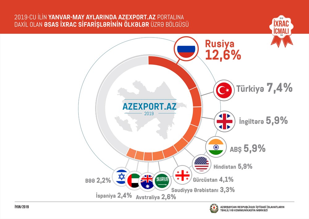 Bu ilin may ayında isə portala daxil olan ixrac sifarişlərinin dəyəri 32,5 milyon ABŞ dolları təşkil edib və ötən ilin may ayı ilə müqayisədə 17,3 faizlik artım qeydə alınıb. 2019-cu ilin 5 ayı ərzində portala daxil olan ixrac sifarişlərinin ilk beşliyində isə Rusiya (12,6%), Türkiyə (7,4%), İngiltərə (5,9%), ABŞ (5,9%) və Hindistan (5,9%) qərarlaşıb.