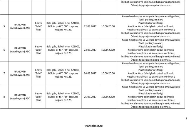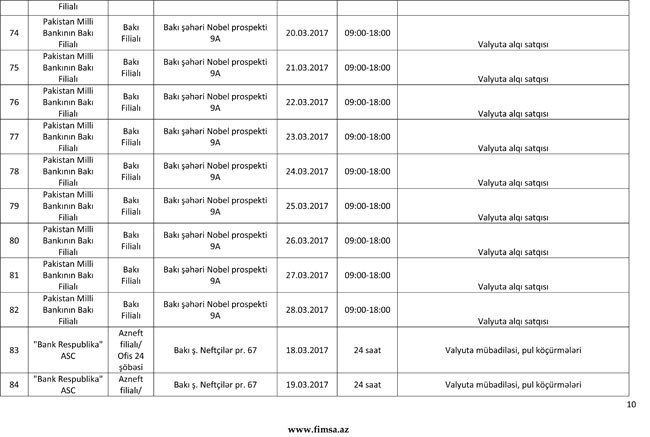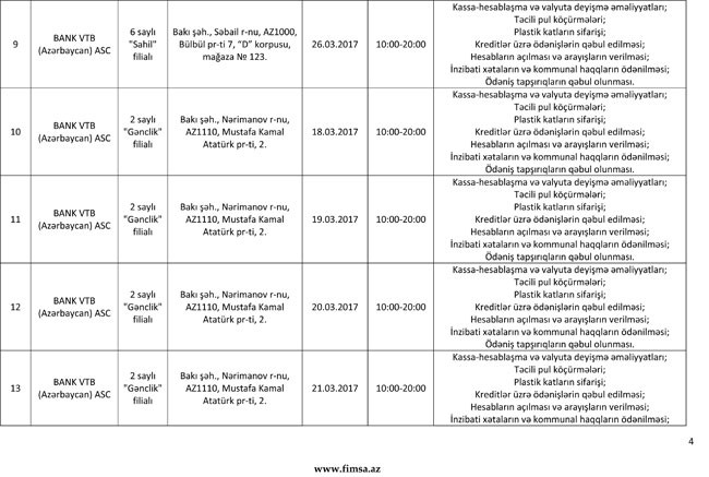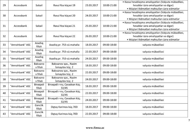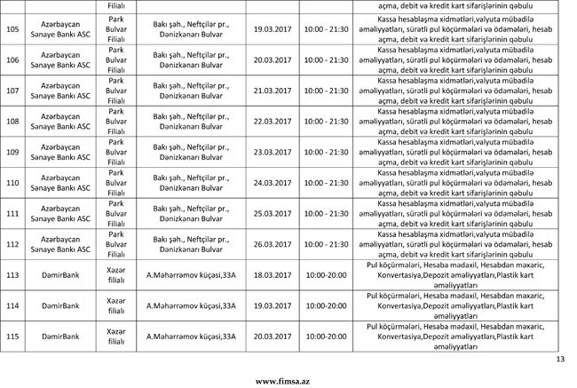 18-26 mart tarixlərində çalışacaq bank filial və şöbələrinin siyahısı və ünvanları ilə www.fimsa.az saytında tanış olmaq olar.