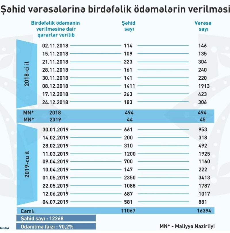 Dövlət başçısının 19 aprel 2018-ci il tarixli və 28 yanvar 2019-cu il tarixli Fərmanlarına əsasən, ümumilikdə 12268 şəhidin vərəsələrinin birdəfəlik ödəmə almaq hüququ müəyyən edilib. Bu günədək onlardan artıq 11067 şəhidin 16394 vərəsəsinə birdəfəlik ödəmənin verilməsinə dair qərar qəbul olunub.