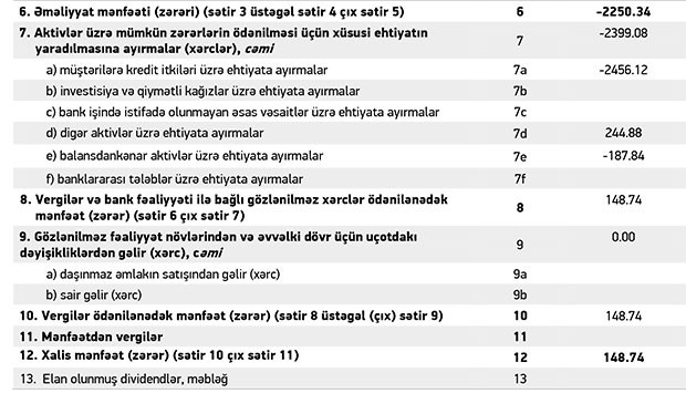 Xatırladaq ki, 2018-ci ilin 1-ci yarısında “AtaBank”ın cəmi gəlirləri 23 milyon 652 min manat, cəmi xərcləri isə 25 milyon 108 min manat təşkil etmişdi. Həmin vaxt da xərclər gəlirləri üstələdiyindən Bankın 1 milyon 456 min manat əməliyyat zərəri yaranmışdı. Lakin ehtimal olunan kredit və depozit itkiləri üçün yaradılmış ehtiyatların 1 milyon 578 min manatı azad olduğundan və mənfəətə əlavə edildiyindən, həm əməliyyat zərəri bağlanmış, həm də bank cari ilin birinci yarısını təxminən 123 min manat xalis mənfəətlə başa vurmuşdu.