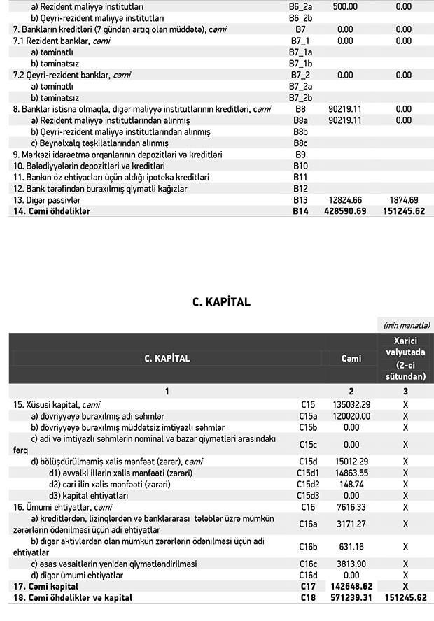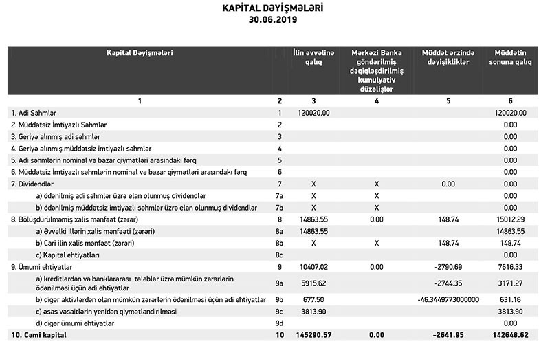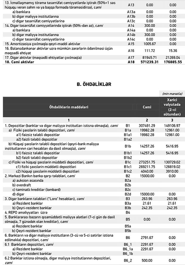 Bank 30 iyun 2018-ci il tarixində 603 milyon 176 min manat cəmi aktivlərə, 458 milyon 512 min manat cəmi öhdəliklərə və 144 milyon 664 min manat cəmi balans kapitalına malik idi.