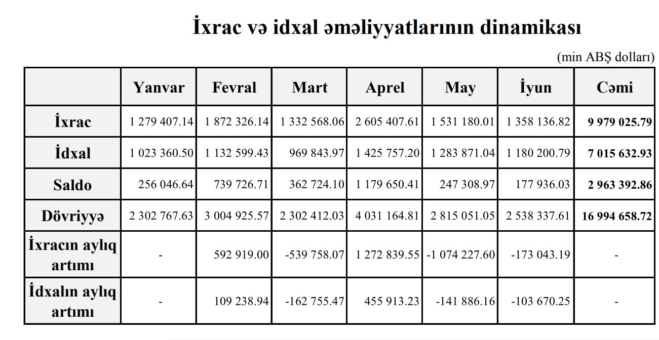 İyunda ixrac 1 milyard 358 milyon 136 min dollar, idxal 1 milyard 180 milyon 200 min dollar, müsbət saldo isə 177 milyon 936 min dollar təşkil edib.