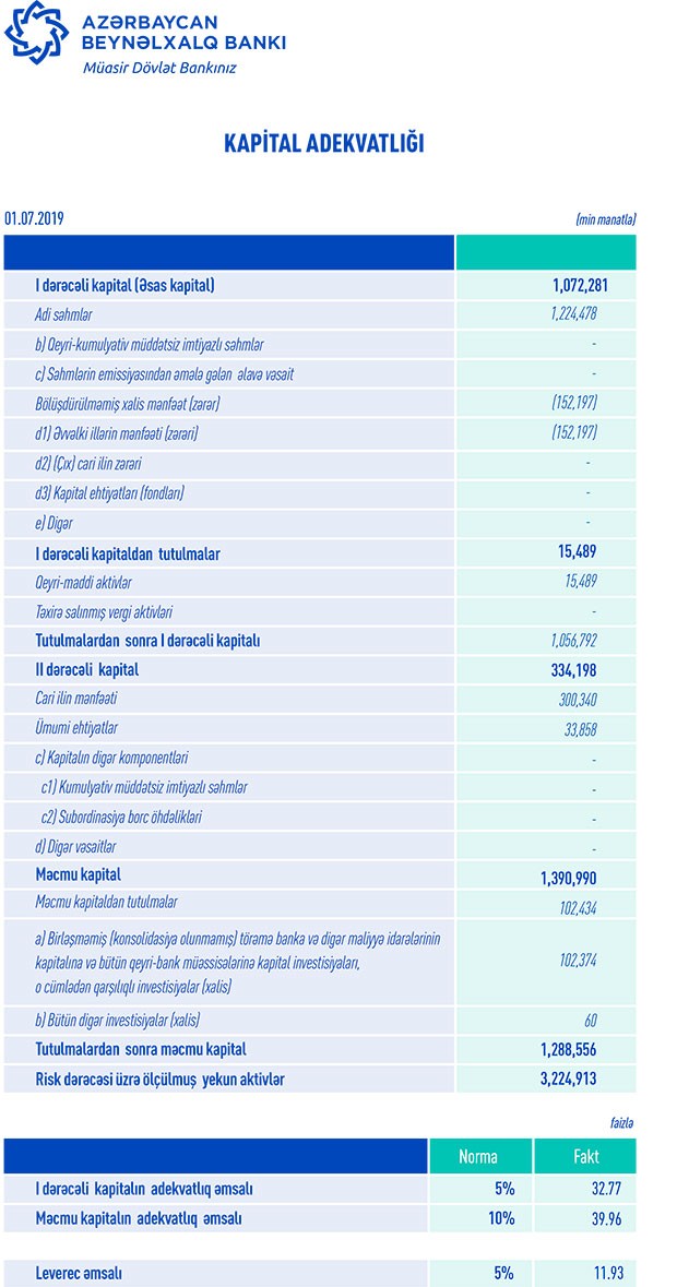 30 İyun 2019-cu il tarixində ABB 1 milyard 470 milyon manat cəmi kapitala malik olub. Ötən ilin eyni tarixində isə cəmi kaptal 1 milyard 188 milyon 538 min manat təşkil etmişdi. Həmçinin İyunun sonunda Bank 1 milyard 288 milyon 556 min manat məcmu kapitala malik olub.