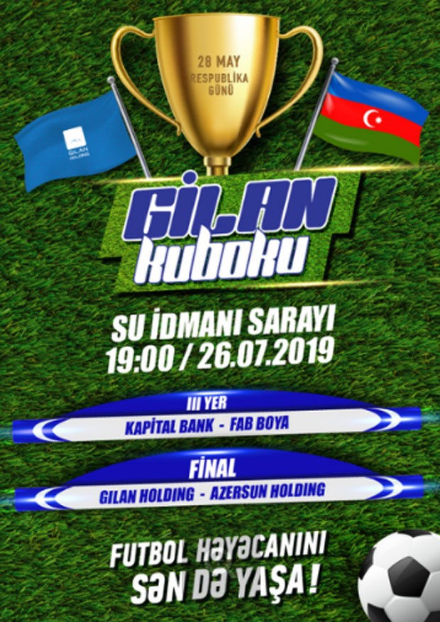 Sabah, 26 iyul 2019-cu il tarixində Su İdmanı Sarayının mini futbol meydançasında “Gilan Kuboku” çempionatında birinci yer uğrunda qarşılaşma “Gilan Holdinq” və "Azərsun Holdinq" komandaları arasında baş tutacaq. Turnirə böyük həvəslə qatılan, iddialı və güclü oyun nümayiş etdirən “FAB Boya” və “Kapital Bank” komandaları öz aralarında 3-cü yerə sahib olacaq komandanı müəyyən edəcəklər.