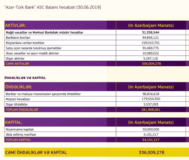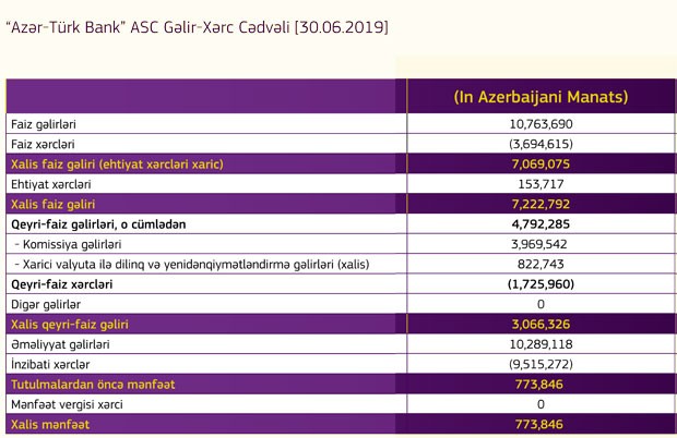 Müqayisə üçün qeyd edək ki, 2018-ci ilin yanvar-iyun dövründə “Azər-Türk Bank”ın cəmi gəlirləri 14 milyon 233 min manat (8 milyon 112 min manatı faiz, 5 milyon 444 min manatı qeyri-faiz gəlirləri, 1 milyon 14 min manatı ehtiyatdan qayıtma və 53 min manat digər gəlirlər), cəmi xərcləri isə 13 milyon 880 min amant təşkil etmişdi. Nəticədə Bankın 353 min manat mənfəəti qalmışdı.