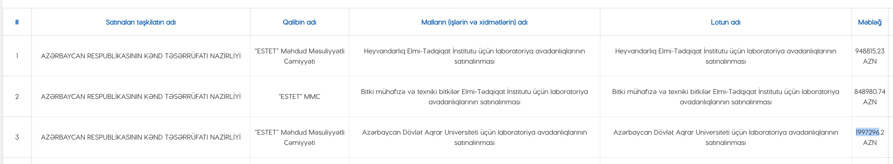Kənd Təsərrüfatı Nazirliyi “ESTET” MMC ilə 3 müqavilə bağlayıb. Müqavilələrin cəmi məbləği 3 milyon 795 min manatdır.