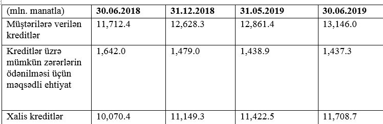 30 İyun 2019-cu il tarixində kreditlər üzrə mümkün zərərlərin ödənilməsi üçün məqsədli ehtiyat 1 milyard 437.3 milyon manat təşkil etdib. Ötən ilin sonunda bu məbləğ 1 milyard 479 milyon manat idi.
