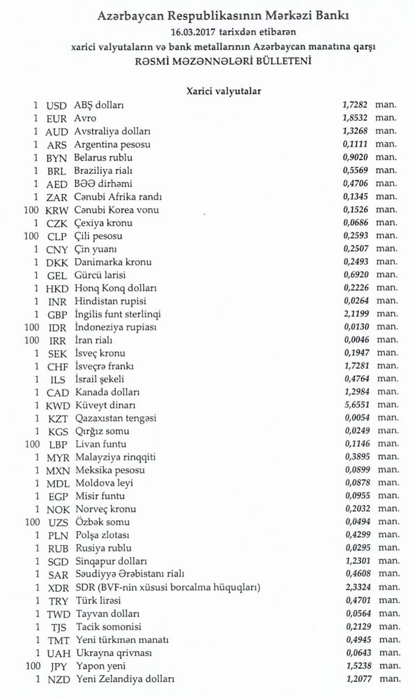 Martın 16-na Mərkəzi Bankın açıqladığı rəsmi Dollar/manat məzənnəsi Martın 15-i ilə müqayisədə dəyişməyərək 1,7282 manatda qalıb, Avro/manat məzənnəsi isə 1.8532 manata qalxıb.