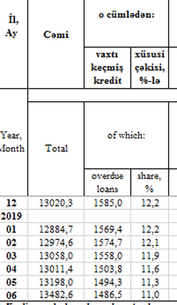 30 İyun 2019-cu il tarixinə 13 milyard 482,5 milyon manat kreditin 11%-nin və ya 1 milyard 486,5 milyon manatının ödəmə vaxtı keçib. Bu nisbət ötən ilin sonunda 12,2%, Mayın sonunda isə 11,3% idi.