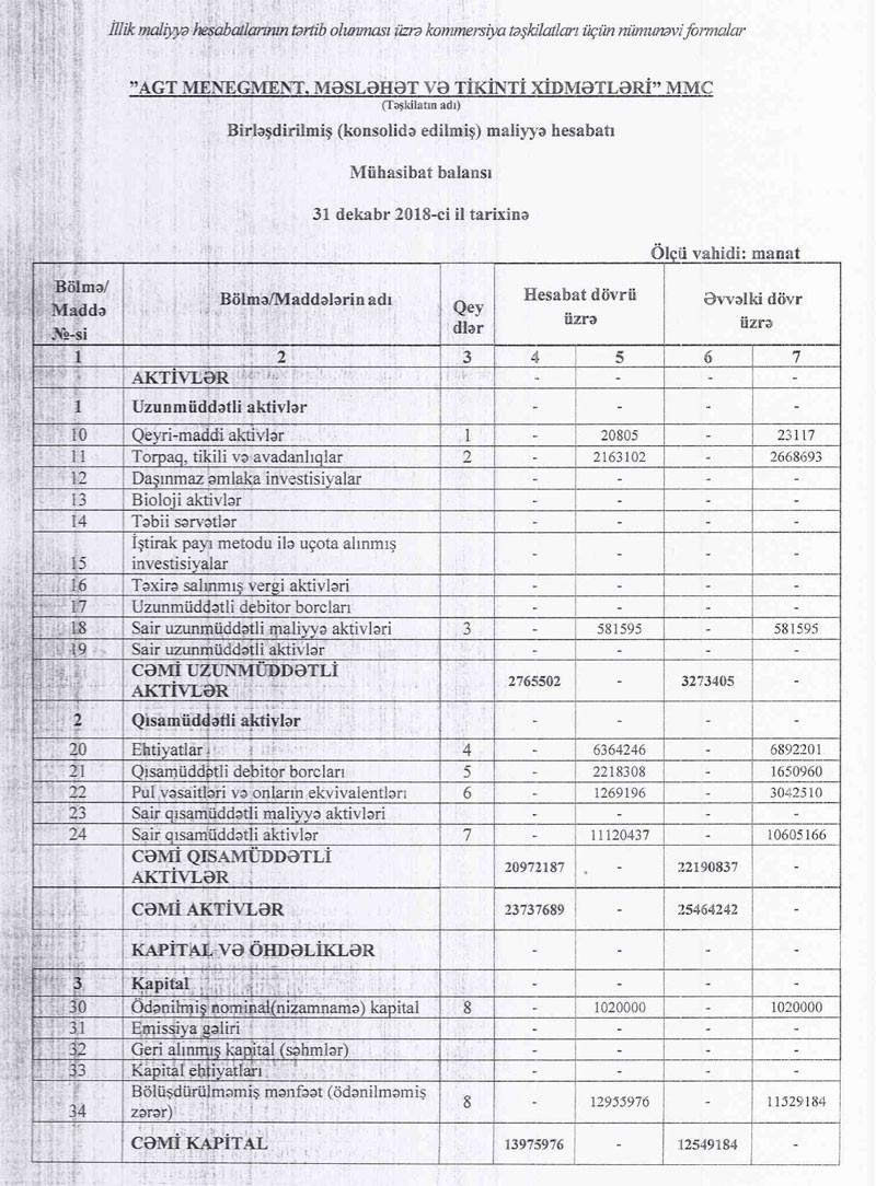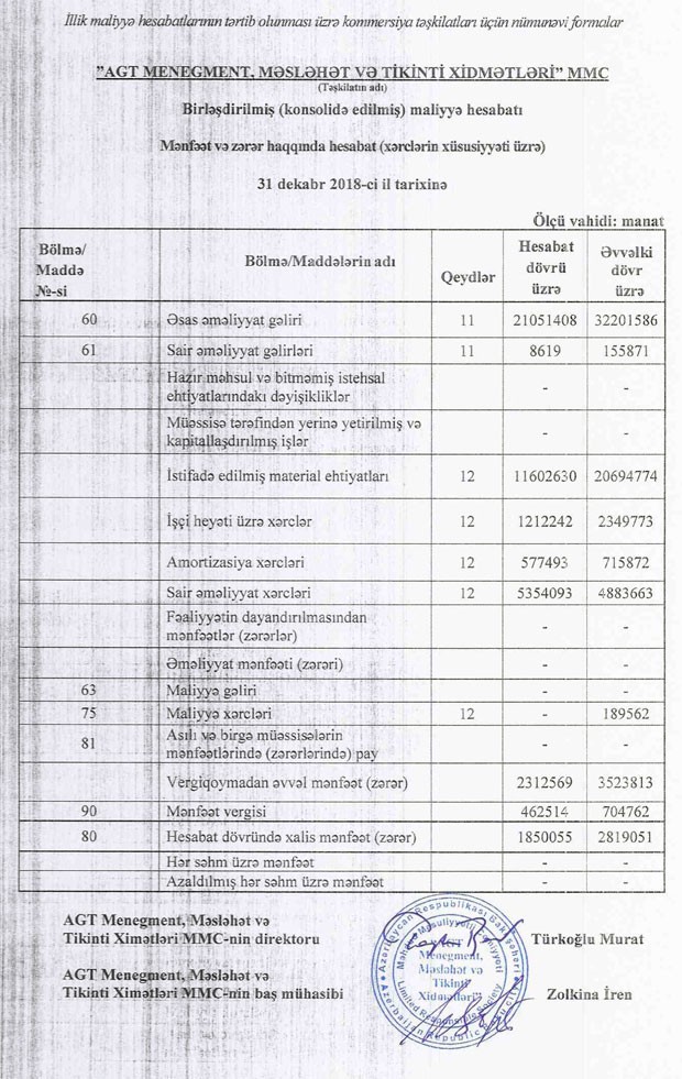 “AGT Menecment Məsləhət və Tikinti Xidmətləri” MMC 2018-ci ili 1 milyon 850 min manat xalis mənfəət ilə başa vurub. 2017-ci illə müqayisədə şirkətin xalis qazancı 969 min manat və ya 34,4% azalıb. Azalmanın səbəbi “AGT”nin gəlirlərinin azalmasıdır.