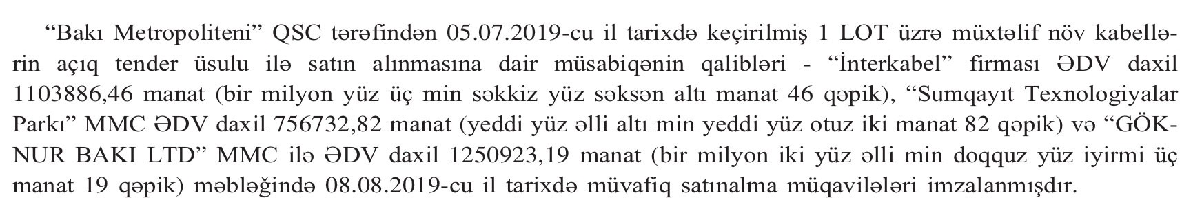 3 kabel tədarükçüsü "Bakı Metropoliteni"ndən sifariş aldı