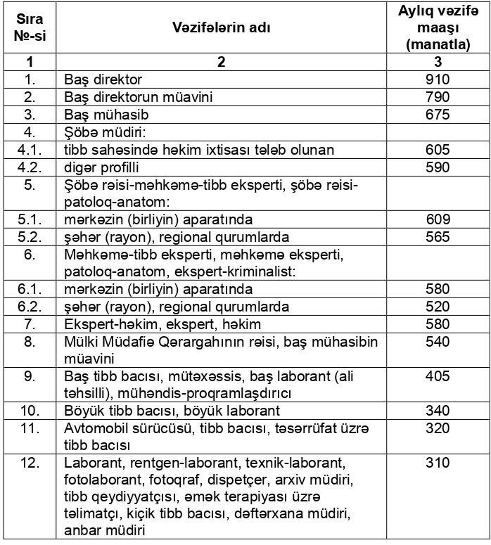 Dəyişikliyə əsasən, Səhiyyə Nazirliyinin Məhkəmə-Tibbi Ekspertiza və Patoloji Anatomiya Birliyinin və Məhkəmə Psixiatrik Ekspertiza Mərkəzinin işçilərinin aylıq vəzifə maaşları artırılıb.