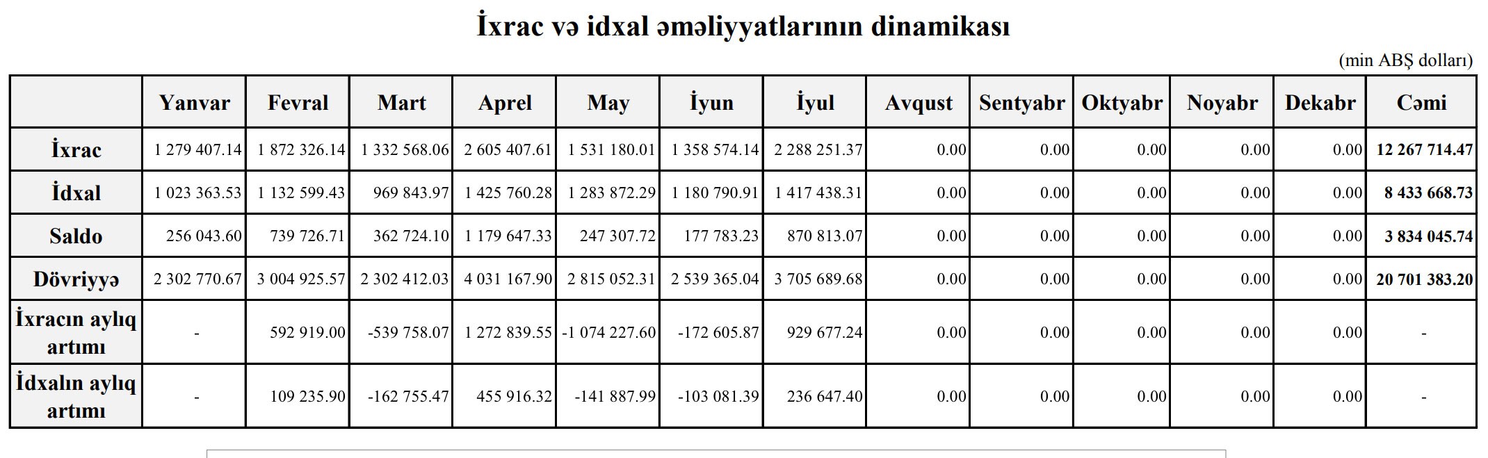 İllik müqayisədə (ötən ilin 7 ayı ilə) idxal 42%, ixrac 14,1% artıb, saldo isə 4,2% azalıb.