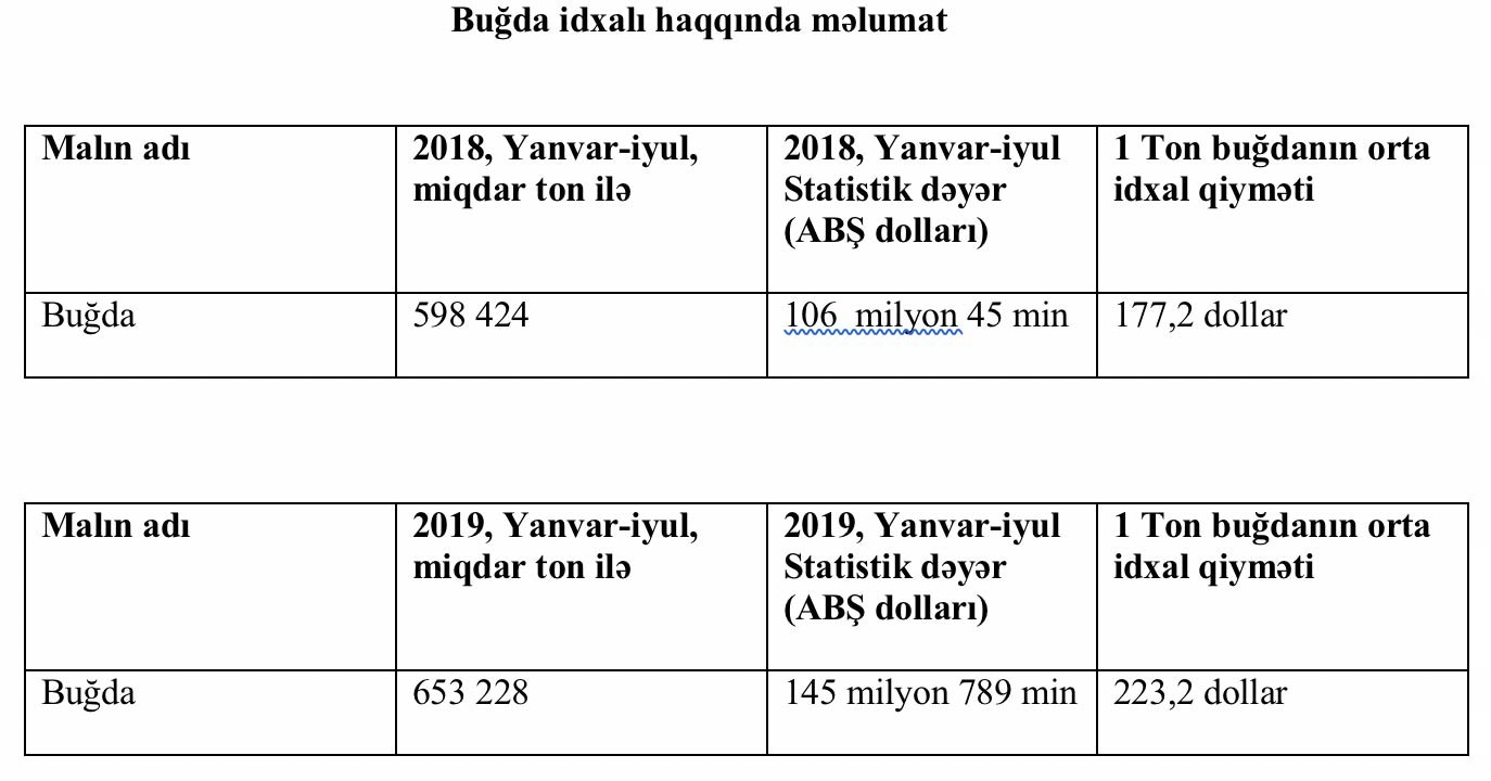 Buğda idxalının dəyər ifadəsində miqdar ifadəsindən daha sürətli artması bu məhsulun bahalaşdığına işarədir. Ötən ilin 7 ayında orta hesabla 1 ton buğdanın idxalına 177 dollar xərlənmişdisə, bu ilin 7 ayında 223 dollar xərclənib (buğda idxalı 26% bahalaşıb).