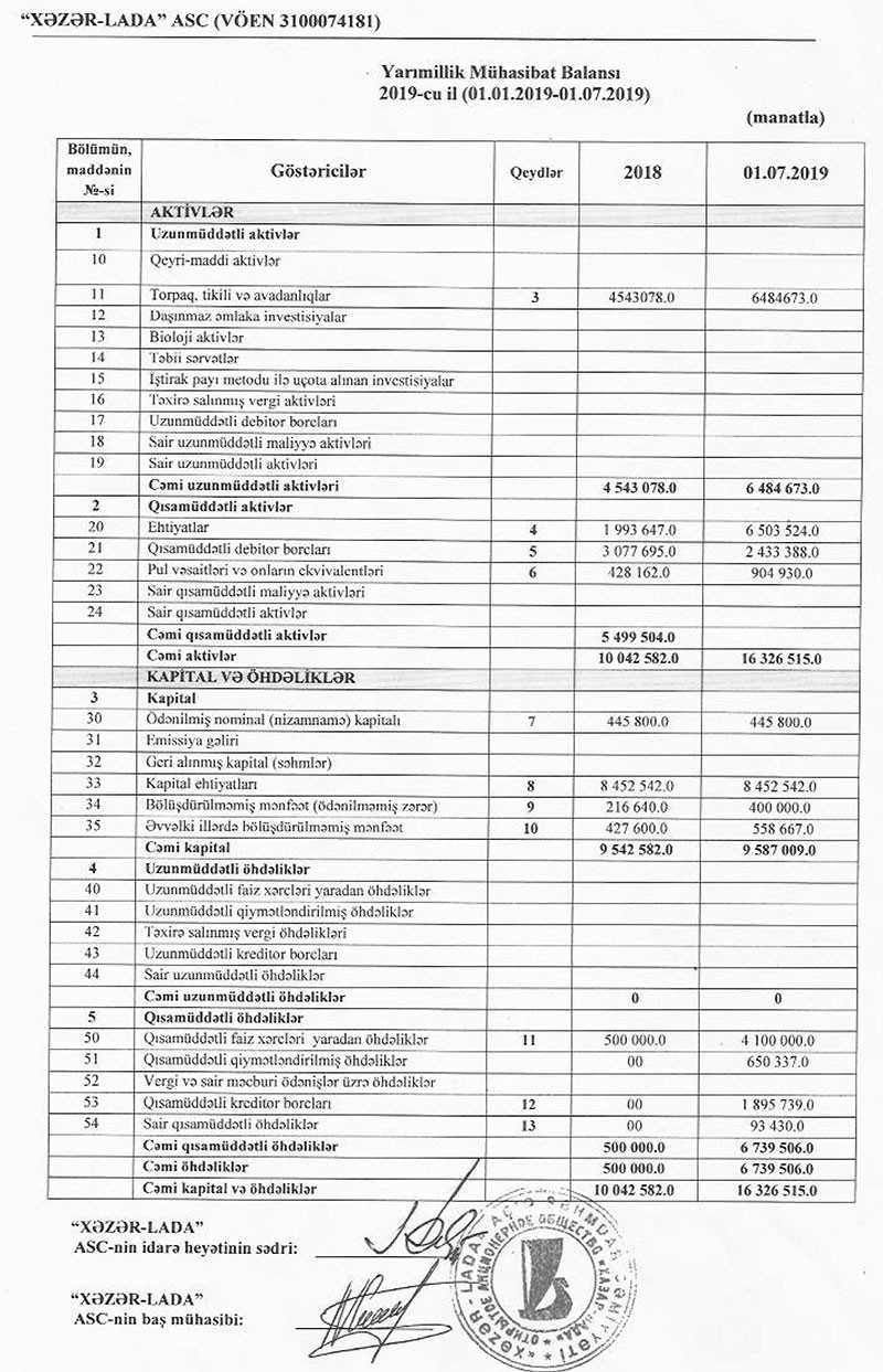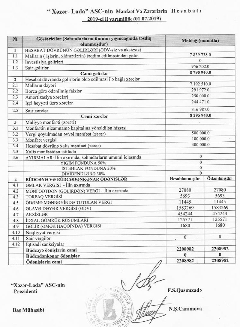 Müqayisə üçün qeyd edək ki, 2018-ci ilin 1-ci yarısında “Xəzər-Lada”nın cəmi gəlirləri 6 milyon 827 min manat, cəmi xərcləri 6 milyon 677 min manat, vergiqoymadan əvvəlki mənfəəti 150 min manat, xalis mənfəəti isə 120 min manat təşkil etmişdi.