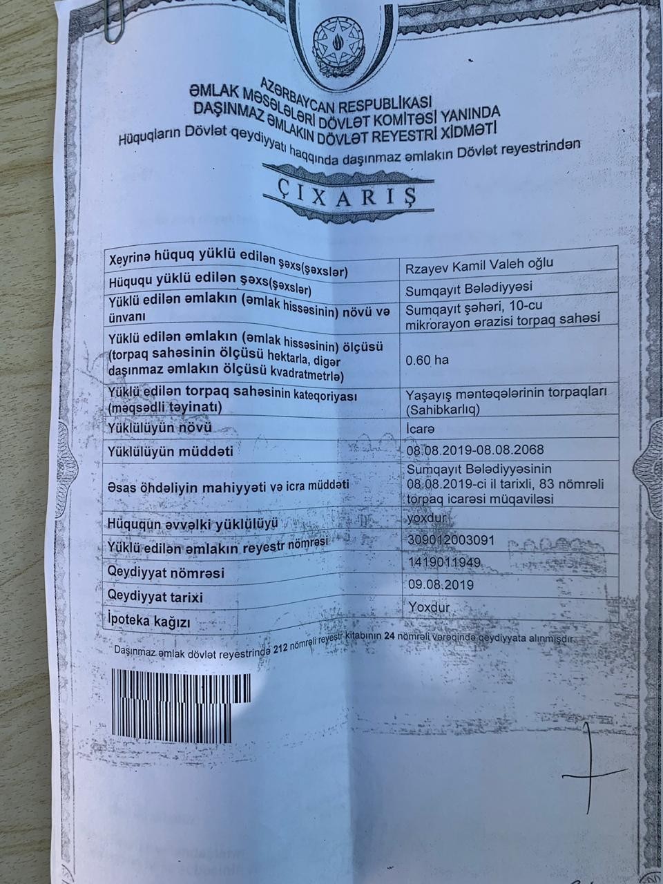 Bakı sakini, “Fuad MTK”nın direktoru Emil Aslanov şirkətə məxsus olan torpaq sahəsinin 60 sotunun Sumqayıt bələdiyyəsi tərəfindən ləğv edilərək digər şəxsə icarəyə verildiyini deyir.