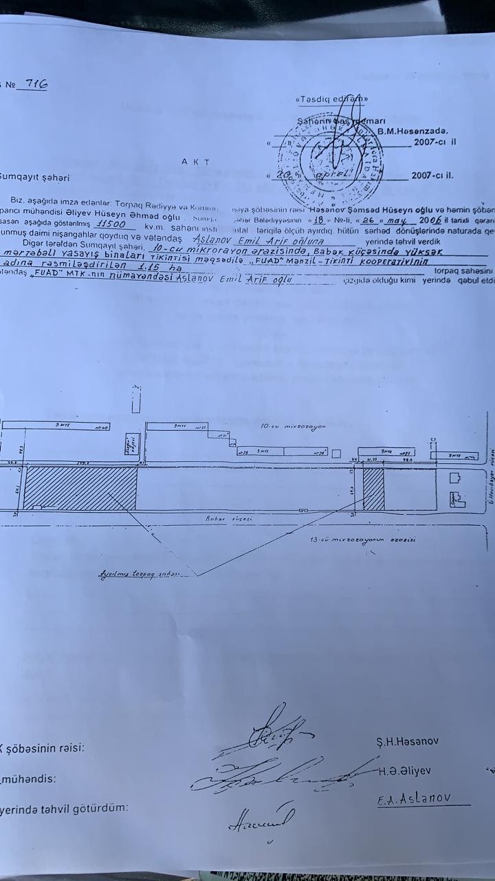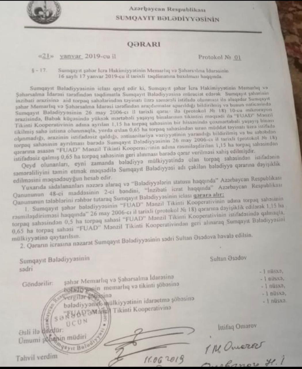 “Torpaq “Fuad MTK”nın ərazisi kimi rəsmiləşdirilib. Həmin ərazi 8 bloklu binanın tikilməsi üçün layihələndirilib. 2 blok artıq tikilib. Sumqayıt bələdiyyəsi 2018-ci ildə Sumqayıt İnzibati İqtisad Məhkəməsinə müraciət edərək torpağın təyinatı üzrə istifadə olunmadığına dair iddia qaldırıb. Məhkəmə həmin iddianı rədd edərək iddiaçını 200 manat məbləğində cərimə edib. 2019-cu ilin yanvar ayında bələdiyyə məhkəmə qərarı olmadan bizim icarə müqaviləsini ləğv edib. Bizim icarə müqaviləsi isə cari ilin dekabrın 31-nə kimi qüvvədədir. Torpağın 60 sotunu Rzayev Kamil Valeh oğlunun adına rəsmiləşdiriblər. Biz tikintini 2015-ci ildən davam etmək istəyirik. Ancaq ərazidə olan drenaj sistemi, kafelər tikinti aparmağımıza mane olur. Biz bu qanunsuz ləğvedilmə məsələsi ilə bağlı məhkəməyə müraciət etmişik. Məhkəmə iclası avqustun 28-də keçiriləcək”.