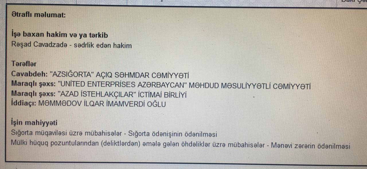 Bununla bağlı vətəndaş “AZSIĞORTA” ASC-ni Bakı Şəhəri Yasamal Rayon Məhkəməsinə vermişdir.