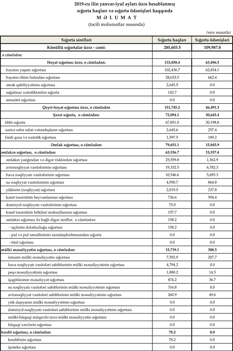 Müqayisə üçün qeyd edək ki, 2018-ci ilin yanvar-iyul ayları ərzində ölkədə fəaliyyət göstərən 21 sığorta şirkəti tərəfindən 459.9 mln. manat məbləğində sığorta haqları toplanmış, 145.9 mln. manat məbləğində sığorta ödənişi həyata keçirilmişdi.