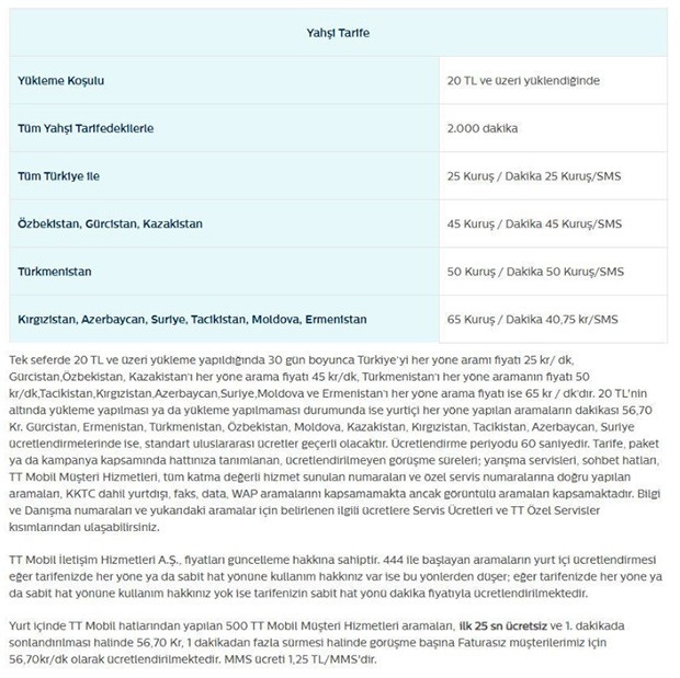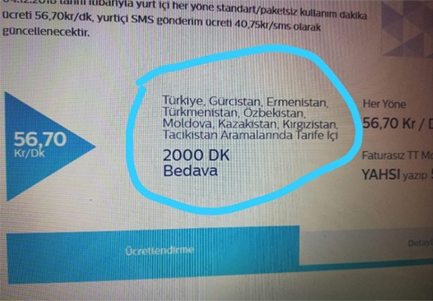 Tarifə əsasən, Türkiyədən Azərbaycan, Qırğız Respublikası, Suriya, Tacikistan, Moldova və Ermənistana zəngin dəqiqəsi 19 qəpikdir (65 kuruş). Eyni zamanda tarifə qoşulan abunəçilərə Türkiyə, Gürcüstan, Ermənistan, Türkmənistan, Özbəkistan, Moldova, Qazaxıstan, Qırğızıstan və Tacikistan da daxil olmaqla 2000 dəqiqə pulsuz danışıq imkanı yaradılıb. Ancaq siyahıda Azərbaycanın adı yoxdur. Bu da Türkiyədə təhsil alan, işləyən və yaşayan Azərbaycan vətəndaşlarının böyük narazılığına səbəb olub.