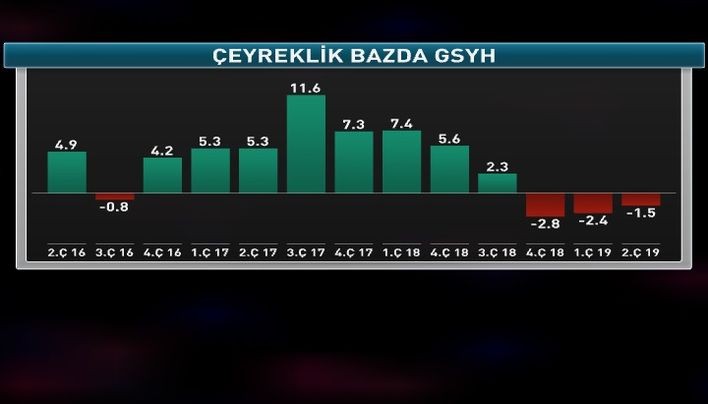 Türkiyə iqtisadiyyatı 2019-cu ilin 2-ci rübündə ötən ilin eyni dövrü ilə müqayisədə 1.5 faiz azalıb, Ümumi Daxili Məhsul (ÜDM)1-ci rübə nisbətən isə 1.2% artıb.