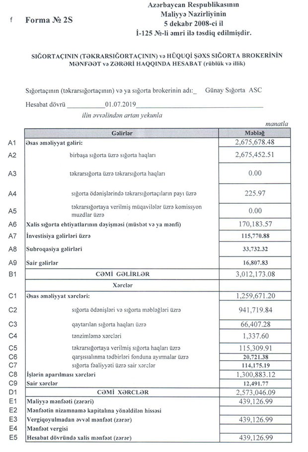 “Marja” Şirkətin yarımillik hesabatına istinadən xəbər verir ki, cari ilin yanvar-iyun dövründə “Günay Sığorta”nın cəmi gəlirləri 3 milyon 12 min manat, cəmi xərcləri 2 milyon 573 min manat, əməliyyat mənfəəti isə 439 min manat təşkil edib. Şirkət əməliyyat mənfəətindən vergi ödəməyib.