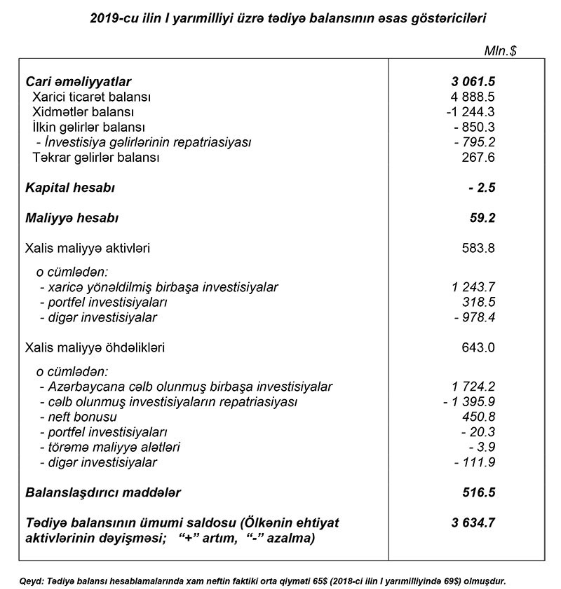 2019-cu ilin 1-ci yarısında Azərbaycanın tədiyə balansında 3 milyard 635 milyon dollar profisit yaranıb.