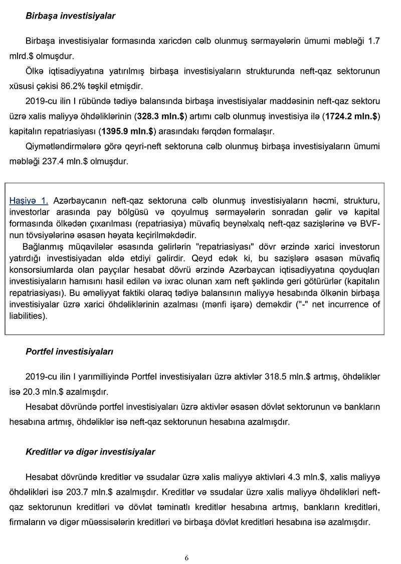 2019-cu ilin 1-ci yarımilliyi üzrə cari əməliyyatlar hesabında 3.1 mlrd. dollar (ötən ilə müvafiq dövrünə nəzərən 13.1% azalma) məbləğində profisit yaranmış, o cümlədən neft-qaz sektoru üzrə profisit ötən ilə müvafiq dövrünə nəzərən 2.1% (132 mln.dollar) azalaraq 6.2 mlrd. dollar, qeyri-neft sektoru üzrə cari əməliyyatlar balansı kəsiri isə 11.9% (330 mln.dollar) artaraq 3.1 mlrd. dollar məbləğində olmuşdur. Nəticədə cari hesabın neft-qaz sektorunun profisiti qeyri-neft sektoru üzrə kəsiri tam örtmüşdür. Cari əməliyyatlar balansı ticarət balansının və təkrar gəlirlər balansının profisitinin xidmətlər balansının və ilkin gəlirlər balansının kəsirini tam örtməsi hesabına formalaşmışdır.
