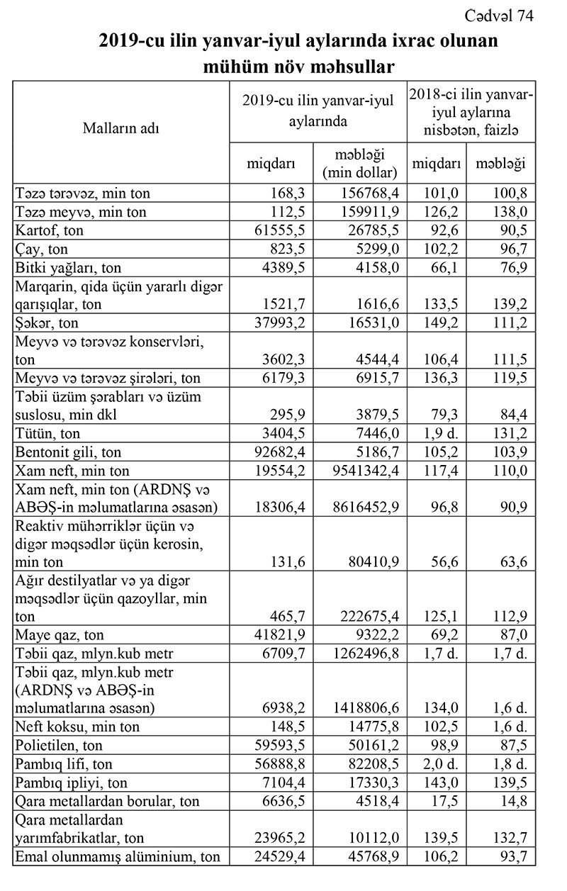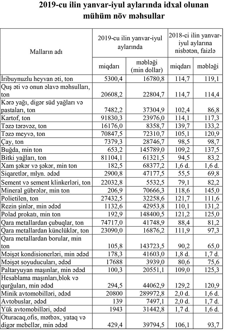 2019-cu ilin yanvar-iyul aylarında ixrac və idxal olunan mühüm növ məhsullar. "Marja" Dövlət Statistika Komitəsinə istinadən təqdim edir.