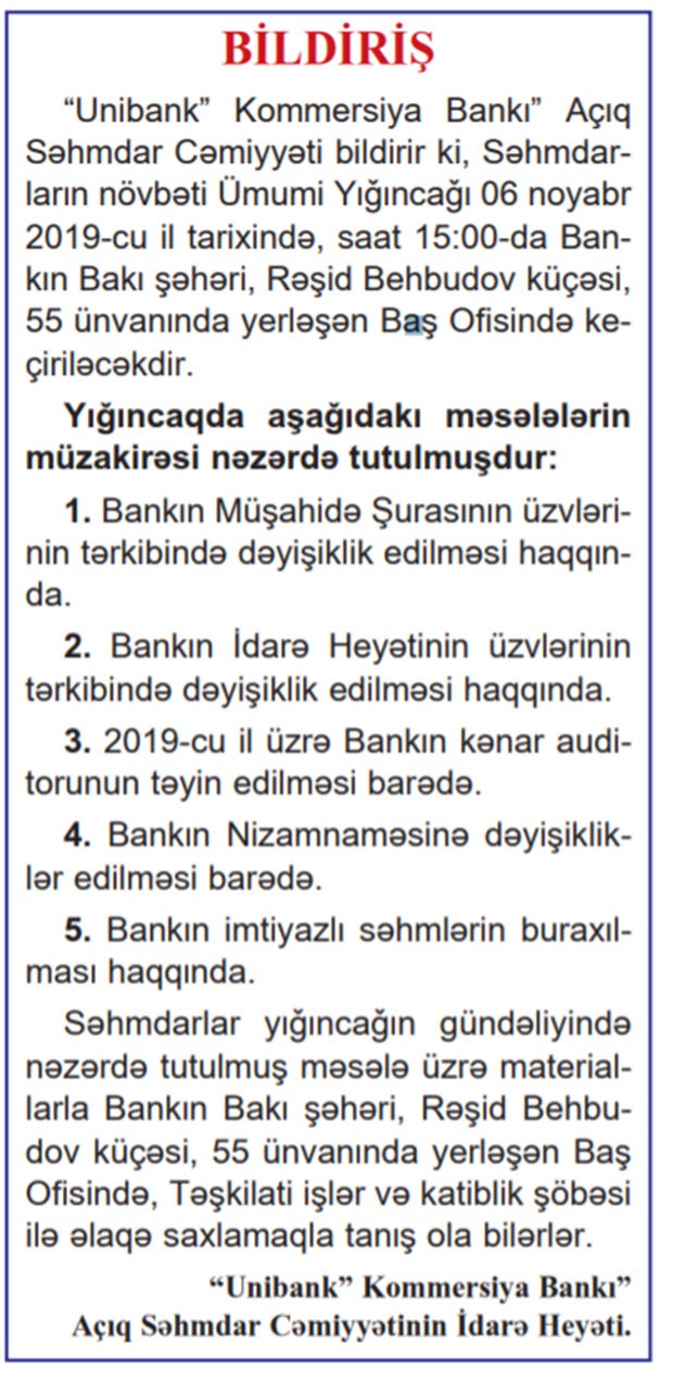 06 Noyabr 2019-cu il tarixində “Unibank Kommersiya Bankı” ASC səhmdarlarının növbəti Ümumi Yığıncağı keçiriləcək.