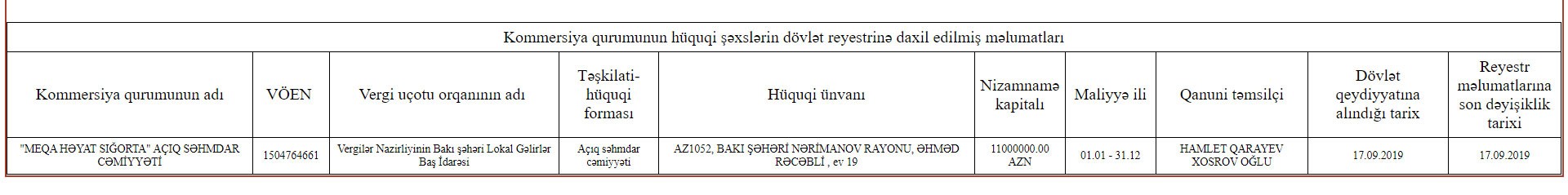 17 Sentyabr 2019-cu il tarixində Vergilər Nazirliyi "Meqa Həyat Sığorta" ASC-ni dövlət qeydiyyatına alıb.